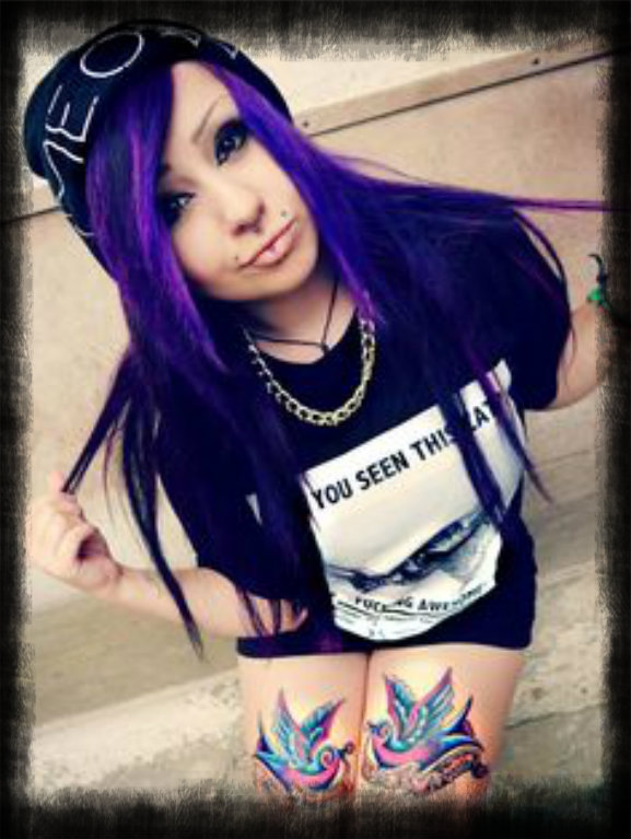 VZHLED POSTAVY: Má výrazné, hnedé oči, ktoré si vždy obtiahne čiernou linkou, ktoré obklopujú jej dlhé husté mihalnice. Nikdy ju nevidieť nenamaľovanú. Tak možno, keď ide spať. Oblieka sa vyzývavo. Zbožňuje tmavé a kožené veci. Na hlave jej sídlia fialové skoro až modré vlasy, ktoré sú vždy upravené na emo štýl. Má veľa piercingov. Dve nad hornou perou, jeden v strede pery, septum a jeden v nose. Na stehnách oboch nôh má fialové tetovania vtáčikov. Na ruke má jednú dlhú jazvu od šikany ktorá sa jej tiahne od päste až po rameno.